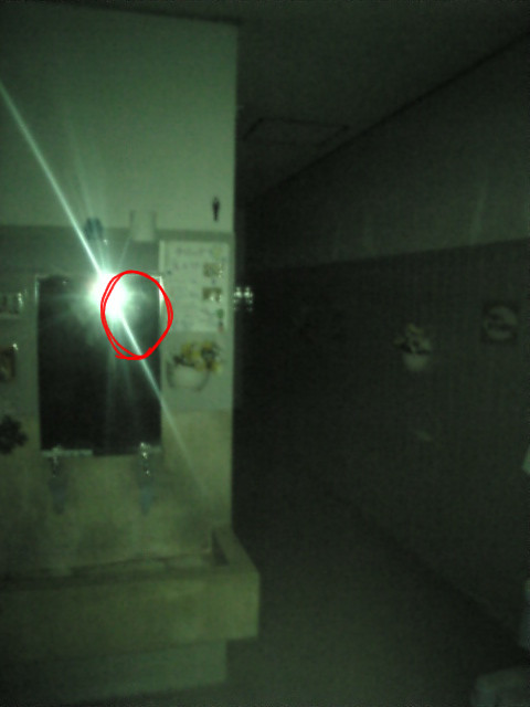 その内トイレの前から奥の方を覗くように撮ったやつなんですけど、ケータイだったら画面小さくてよくわからなかったんですが、パソコンの画面でよーく見ると、何か鏡に顔っぽいのあるんですが。